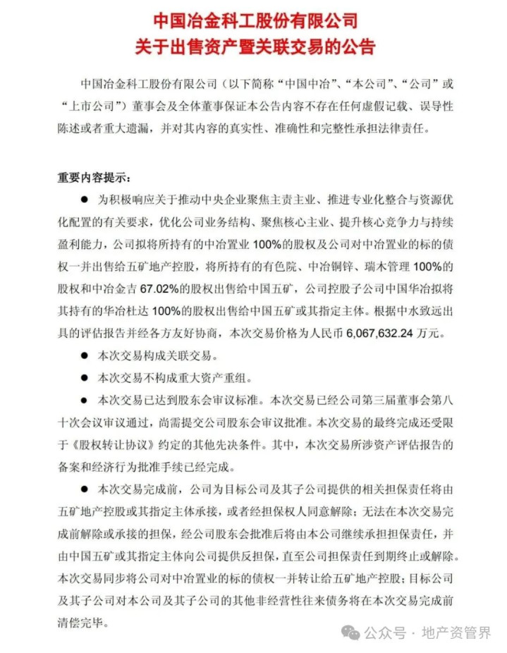 近日,中国中冶公告,拟将所持中冶置业100%股权及对应债权、有色院、中冶铜锌、瑞木管理100%股权,中冶金吉67.02%股权及华冶杜达100%股权,合计作价606.76亿元出售给关联方五矿地产控股和中国五矿。